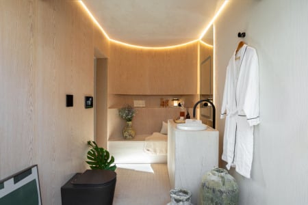 A iluminação é automatizada, podendo criar moods e cenas juntamente com a Alexa. O projeto luminotécnico se dá por fitas de LED espalhadas pelo espaço, criando uma iluminação indireta e difusa, o que resulta em uma atmosfera de penumbra que evoca o relaxamento. O espelho possui iluminação frontal embutida.