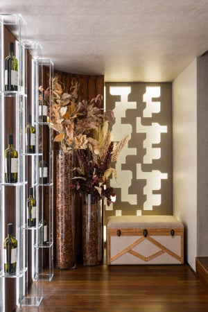 As profissionais utilizam a marcenaria para criar um fluxo que guia o visitante até o ápice do projeto, onde desenham uma tela tensionada com padrões que remetem aos formatos das garrafas. Na lateral, o painel com prateleiras de vidro destaca ainda mais os rótulos especiais.