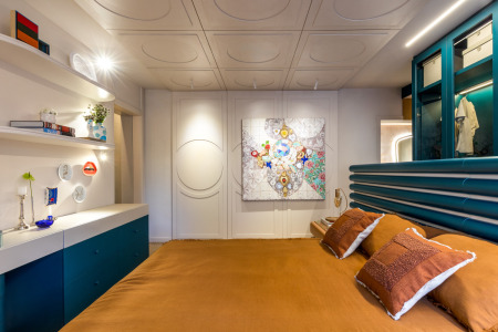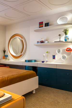A marcenaria embutida, típica da arquitetura da época, garante o máximo aproveitamento do pequeno espaço. Elementos curvos e coloridos comportam os objetos trazidos das aventuras vivenciadas mundo afora pela dupla, que ama viagens e cores.