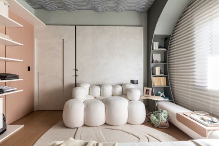 Inspirado em espaços minimalistas, esse ambiente aposta em um layout limpo e cores neutras para convidar ao relaxamento. Paredes e tetos utilizam a cor Recado de Amor com o aveludado efeito Velvet.