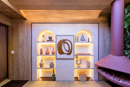 Esse espaço foi projetado para transmitir calma, harmonia e espiritualidade. Para criar essa atmosfera, foram utilizados elementos naturais como bambu, madeira, pedra e plantas. Iluminação aconchegante, mas mantendo a iluminação natural sombreada pelo bambu no forro, lareira para aquecer e objetos afetivos completam o confortável ambiente, que lança mão do efeito Velvet na cor Branco Areia na parede; Imbuia (Sparlack Cetol Balance Deck) e Preto (Pinta Piso).
