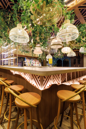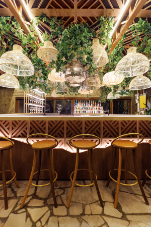 Essa herança ancestral interage com a arquitetura contemporânea. O núcleo essencial do projeto é o bar central, criado como o coração da árvore de jenipapo, enraizada no centro do ambiente. O nome do espaço é inspirado nesta fruta nativa da Amazônia e da Mata Atlântica, da qual os indígenas extraem tintas naturais para suas pinturas corporais. Dessa forma, Ferentz cria uma ligação simbólica e orgânica com a cultura e seus elementos naturais.