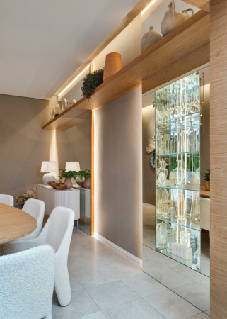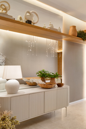 A paleta cromática sofisticada investe em tons mais neutros, como branco, bege, marfim e marrom. O luminotécnico conta com microleds e pode ser controlado por automação. As nuances neutras se misturam à iluminação cênica para arrematar o tom aconchegante deste projeto repleto de personalidade, que é acolhedor nos acabamentos e arrojado nas formas.