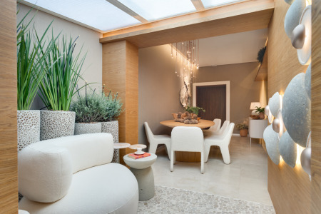 Outros elementos orgânicos, como o piso de mármore, a vegetação e a incidência de luz natural trazem o toque da natureza para dentro do espaço. Além disso, a área de jantar e jardim se integram a partir de uma cobertura de vidro, permitindo que o espaço seja utilizado para além da mesa.