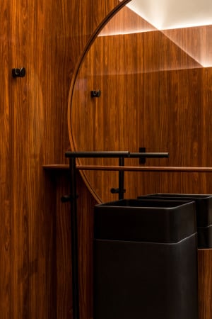 A nobreza da composição revela o conceito de “casa boutique” da CASACOR Paraná 2024. Destacam-se o painel brilhante em pau-ferro, as peças de design assinado e o uso contínuo da iluminação indireta, elementos essenciais para criar uma ambientação funcional e elegante.