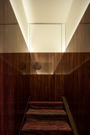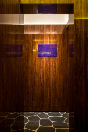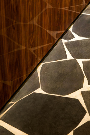 O uso de materiais naturais como pedra, cerâmica e madeira evoca uma conexão afetuosa com a natureza. A iluminação indireta contínua cria a sensação de aconchego ao suavizar os contornos, complementando a experiência da tranquilidade em movimento do espaço.