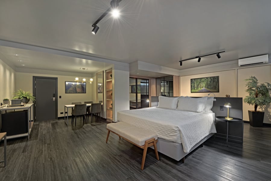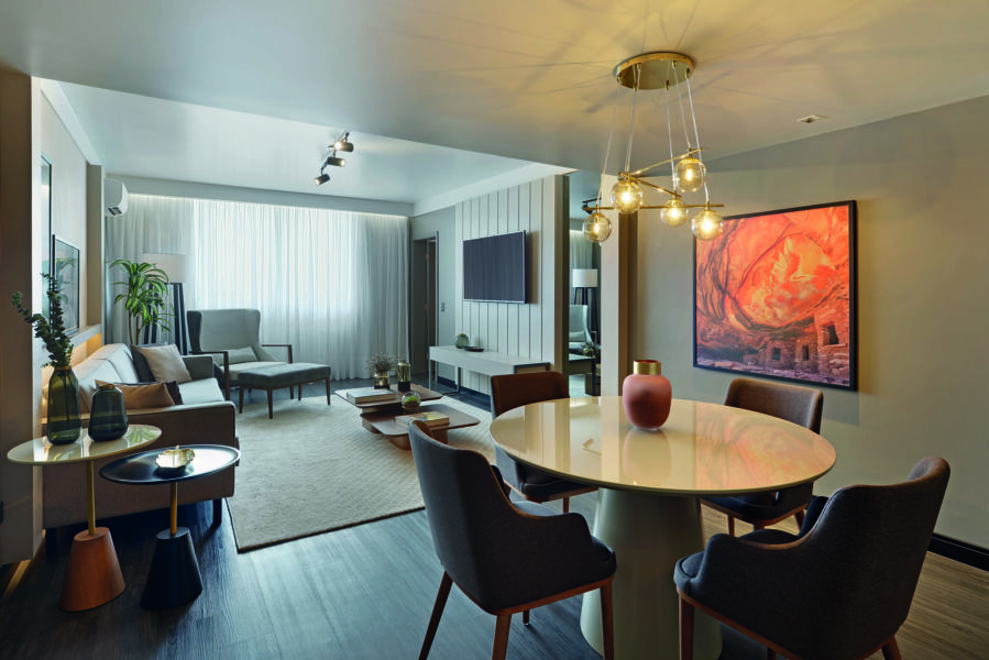 As suítes executivas e a presidencial tiveram seus banheiros reformados, com troca de revestimentos, louças, metais e acessórios. A banheira de hidromassagem conta com cromoterapia e as pias foram esculpidas em mármore branco. Na executiva, há duas opções de layouts: um integrado entre quarto, sala e banheiro e outro com ambientes bem separados e definidos. As cores neutras em tons de cinza e madeira com linhas sóbrias se mantêm, sendo complementadas com obras do fotógrafo Marcelo Krause que retratam a natureza em todo o seu esplendor.
