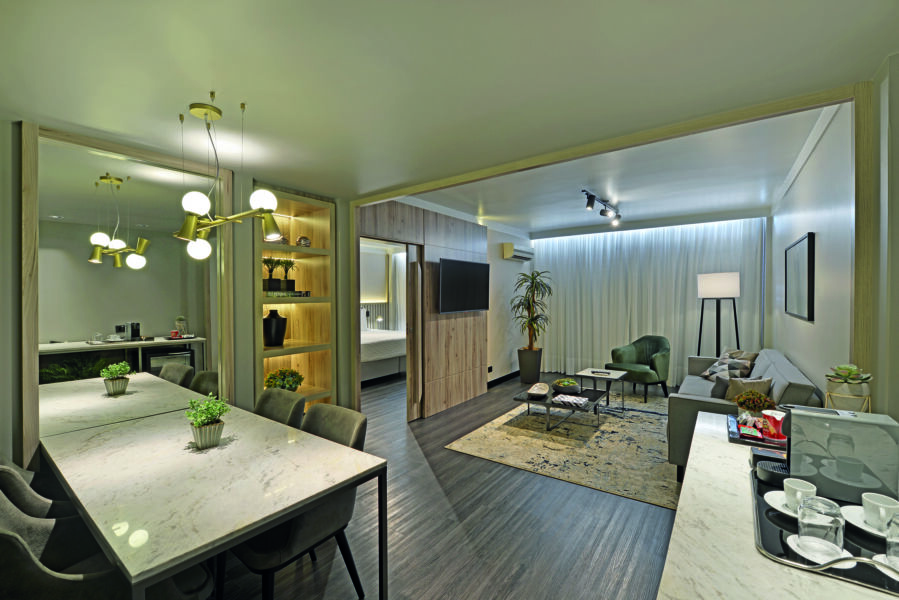 Com linhas retas e limpas, o projeto proporciona leveza e amplitude aos apartamentos compactos, que tiveram o piso trocado por vinílico, nova marcenaria, pintura de teto e paredes e a inclusão de novos espelhos, iluminação e papel de parede.