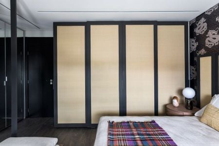 A palhinha natural que reveste o armário e a cabeceira confere o toque necessário de aconchego a este quarto. Atemporal, o acabamento conta com uma trama vazada que equilibra naturalidade e