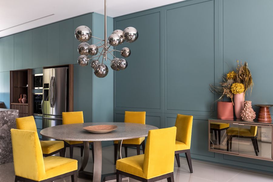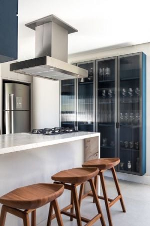 Neste projeto, a cristaleira com vidro canelado foi fundamental para compor o estilo industrial e moderno da cozinha. O móvel apresenta um tom de azul que destaca o belo acabamento do inox.