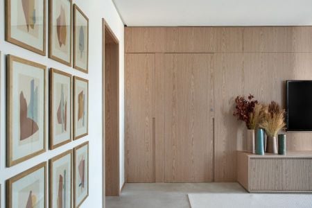 Para um belo resultado estético e funcional: lâmina natural de carvalho. Neste ambiente, o material está aplicado a um painel com porta embutida, conferindo leveza e harmonia ao décor mais clean.