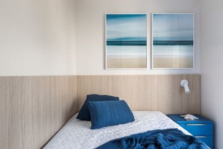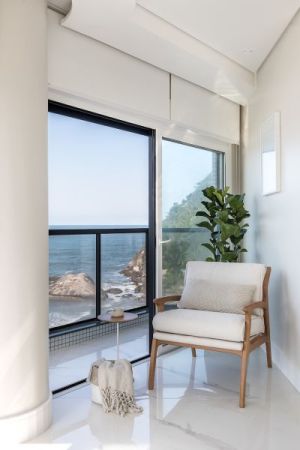 A suíte principal ganha toques de azul que fazem alusão ao mar, além do painel madeirado que sobe de trás da cama até o teto. Um cantinho de leitura faz divisão com a sacada, que também dá vista para a paisagem litorânea.