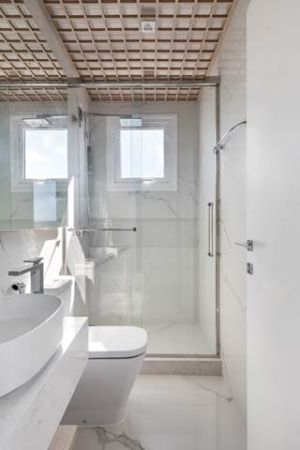 Nos banheiros, tanto sociais quanto das suítes, destaca-se o uso do porcelanato, que garante versatilidade nos estilos: o lavabo segue uma linha mais clean, com destaque para trama de madeira no teto; já o da suíte principal ganha uma opção que replica a estética da pedra natural; o terceiro conta com um delicado ripado madeirado; enquanto o último traz um toque de azul para compor o ambiente.