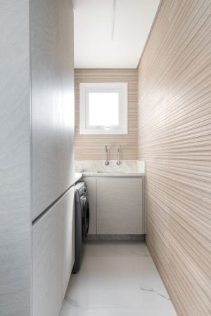 Na área de serviço, o revestimento também é protagonista. O porcelanato com tom aquece o espaço, dando a impressão de um ripado de madeira, mas com a praticidade do azulejo.
