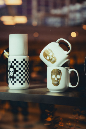Quando a gente começou a pensar nesta coleção, um dos pedidos da Tok&Stok foi que a gente fizesse alguns produtos com a caveira e que a gente reeditasse a caneca, que é um best seller [a caneca preta com a caveira dourada e a caneca branca com a caveira dourada]. São duas peças que a gente teve no passado e eles tiveram muitos pedidos para refazer.