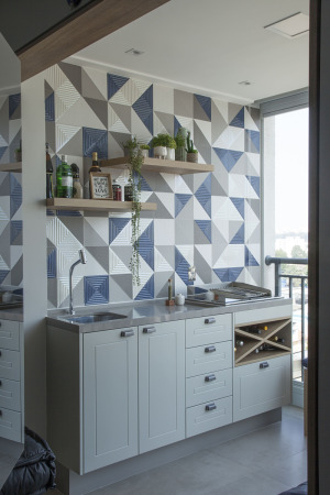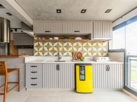 Na varanda gourmet executada pelo arquiteto Bruno Moraes, o ladrilho hidráulico com a estampa que recorda um ‘que’ de retrô. Caracterizado por sua porosidade, o que torna sua instalação mais desafiadora em comparação ao azulejo, o escritório realizou um planejamento cuidadoso da paginação para garantir um resultado estético harmonioso.