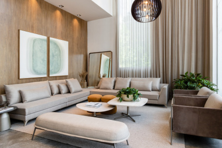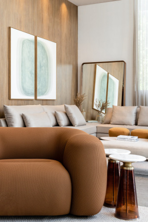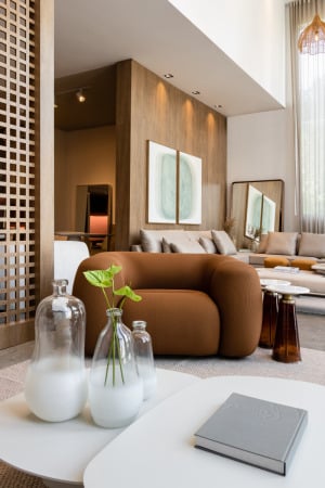 Com marcas renomadas como a Century, Doimo e Essenza, o mobiliário escolhido para compor os ambientes apresentam linhas limpas e simples. A forma segue a função, e os móveis são projetados para serem funcionais, sem excessos decorativos.