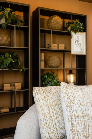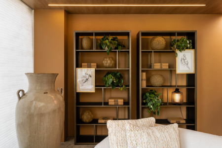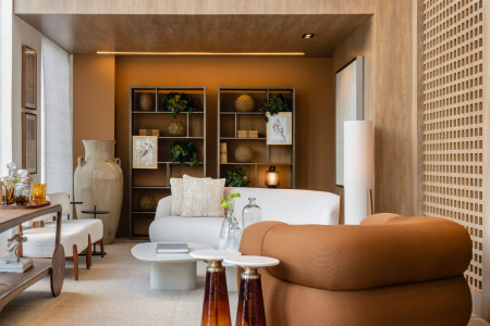 Outro ponto que chama atenção é o uso do Pelle Caramelo, como fundo para duas estantes vazadas. O Pelle é um MDF da Braspan, revestido com couro natural, que traz a textura e a sofisticação do material para todo o ambiente.