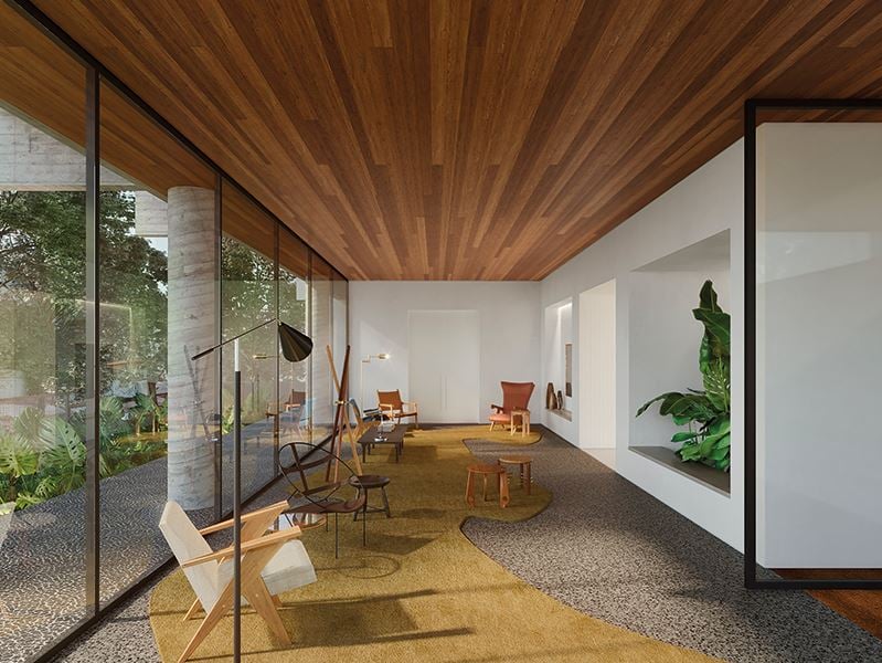 O projeto é contemporâneo e atemporal, integrado ao entorno, sem modismos, com o propósito de inspirar os proprietários e moradores a desenharem sua melhor forma de viver e morar. O projeto de interiores, assinado por Leandro Garcia, prioriza o essencial, sem excessos, somando-se à linguagem contemporânea.