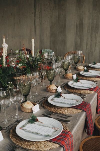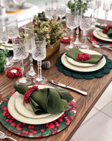 Antes de começar a montagem da mesa, escolha bem a identidade do evento. Neste caso, o Natal. Para a ceia, o horário permite focar em tons mais fortes, que podem ser complementados com bastante decoração e velas!