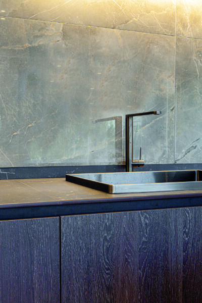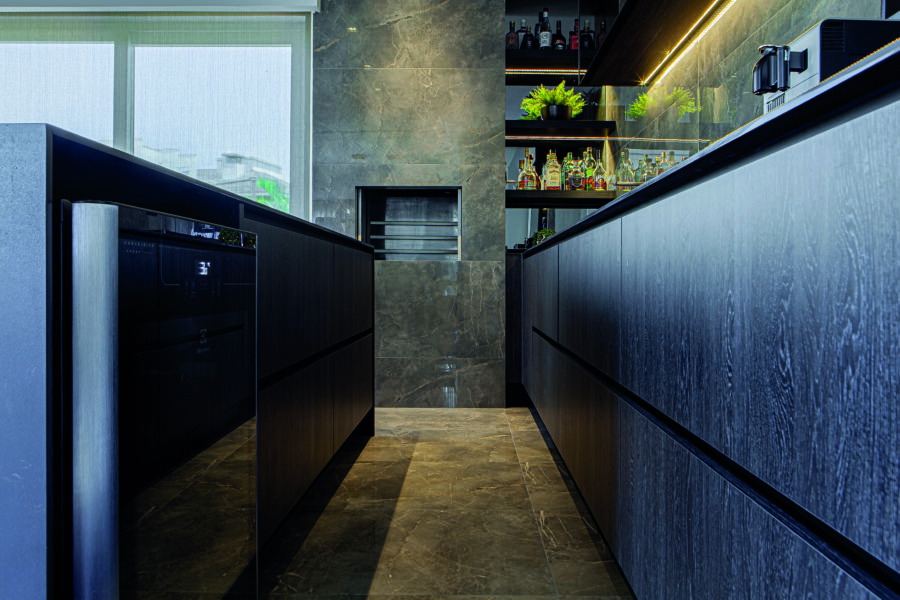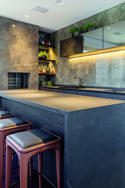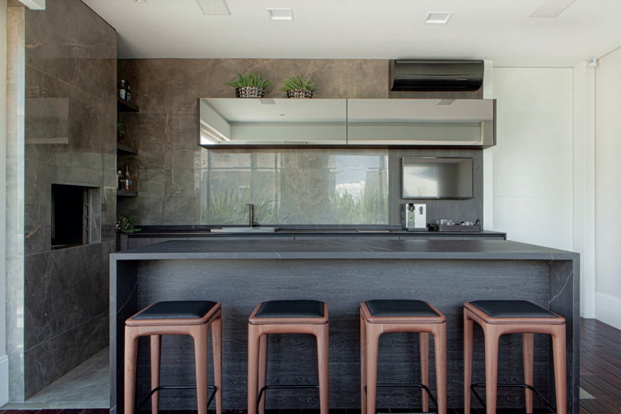 O espaço ficou agradável, tecnológico e funcional. Vários materiais foram escolhidos para facilitar o dia a dia e a manutenção. É o caso das Bancadas em Dekton, da empresa Royal Stone, que são superfícies ultrarresistentes, elegantes, sofisticadas e possuem espessura reduzida para 12 mm. A mescla de revestimentos entre madeira, porcelanato e pedra também foi criteriosamente escolhida, para compor os ambientes de forma harmônica e sofisticada.