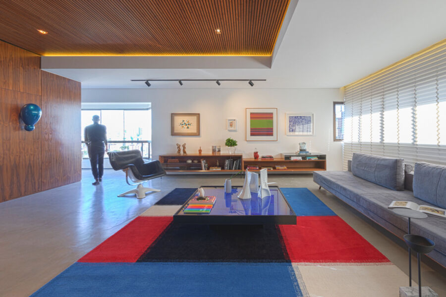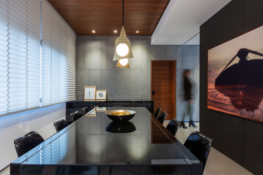 Grandes nomes do design estão presentes no mobiliário assinado. As linhas orgânicas da poltrona Karuselli, de Yorjö Kukkapuro, típicas dos anos 1960, quebram a ortogonalidade compositiva da arquitetura. As poltronas de Flávio de Carvalho, em composição com o sofá de Marcus Ferreira, mostram a força do design nacional. Com desenho de Jorge Elmor, a Luminária Dots, aplicada sobre a boiserie de nogueira americana, alia-se à composição do projeto como um elemento escultural.