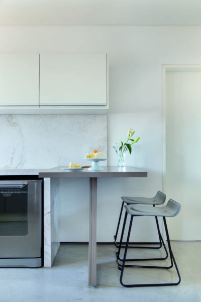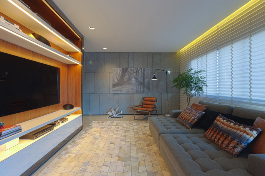 A materialidade e os elementos compositivos do projeto valorizam o grande acervo artístico dos moradores. A linguagem contemporânea e minimalista é pano de fundo para a pinacoteca particular dos proprietários. O piso monolítico e as placas de concreto aplicadas às paredes reforçam os ares de galeria dessa residência. Esses materiais brutos, quase industriais, são equilibrados com a presença da madeira no forro ripado ou no cubo central que contém o lavabo.