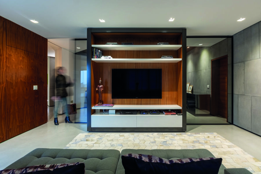 A planta original do edifício onde está localizado o apartamento tem paredes em ângulos irregulares e descontinuidades visuais. A proposta do arquiteto Jorge Elmor foi reconfigurar a disposição da planta em uma proposta mais contemporânea e versátil. Um cubo de madeira foi disposto no centro da área social e articula as diferentes funções do programa sem criar circulações desnecessárias. Painéis deslizantes foram utilizados como fechamento vertical para permitir, ao mesmo tempo, privacidade, amplitude visual e integração, quando necessário, criando condições ideais para grandes eventos ou reuniões mais intimistas.