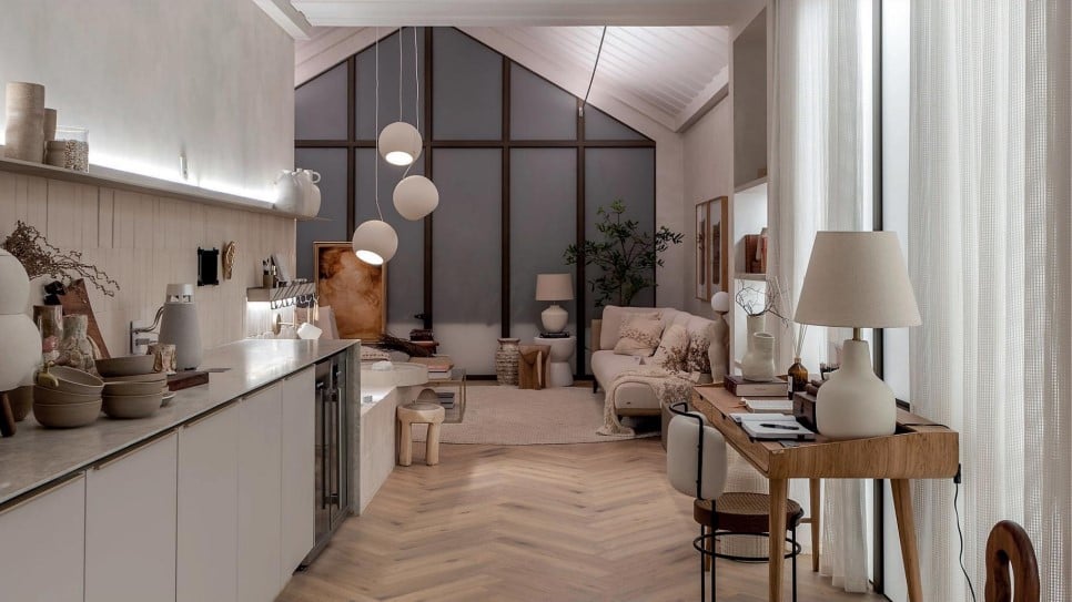 O estúdio: “um lar para dar pause “, assinado pela arquiteta Cilene Lupi, foi pensado para proporcionar conforto, paz e recarregar as energias. Projetado para uma personagem feminina jovem da geração Z, apresenta curvas que lembram o corpo feminino, e as cores do espaço são quentes e acolhedoras. Ornare ganha destaque na cozinha. As linhas Linear e Essential, propostas pela marca, se encaixam perfeitamente à estética do Silestone da Cosentino, que em uma composição de encaixes e intersecções, deu origem ao balcão e à mesa da cozinha.