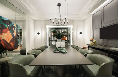 “A felicidade está em ser simples. Me sinto feliz apenas em estar em casa com minha filha e esposa. E, é óbvio, criando espaços. Desde um edifício inteiro até uma sala, capazes de promover o real encontro entre as pessoas. Toda a composição gravita em torno da coluna de jantar Moon III. Ela tem uma forma oval, com elementos verticais e horizontais, de madeira, formando nichos.”