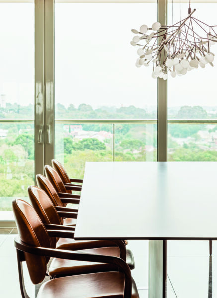 No espaço de 850 m², em Curitiba, a integração das áreas sociais era prioridade para os clientes, no intuito de preservar a identidade e o aconchego. A sala de jantar conta com uma forte presença da madeira nos móveis e nos detalhes do teto. A mesa de jantar Fio, de Jaqueline Terepins, possui um design sutil e harmonioso. O desenho do móvel traz a sensação de que o tampo flutua sobre as bases de sustentação. As cadeiras de couro, o pendente Heracleum Endless, da Moooi, e a persiana de fibra natural, da Nani Chinellato, completam a decoração.