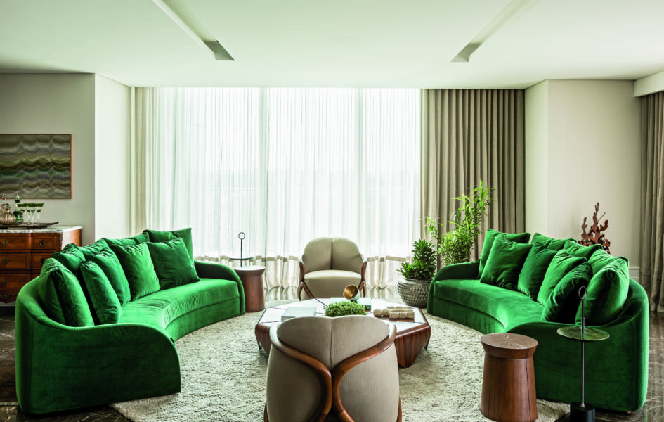 Um dos pontos altos do projeto é o desenho do hall, com a importante escultura de Ângelo Venosa, cercada pela estrutura de madeira, que se assemelha ao tradicional muxarabi árabe. O piso todo em mármore Bronze Armani usado no living recebeu o belíssimo sofá e as poltronas Giorgetti. A mesa de centro Pétala, de Jorge Zalszupin, traz delicadeza e sofisticação ao ambiente.