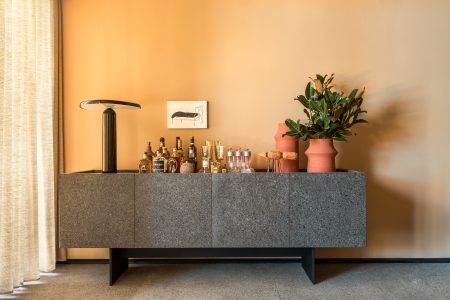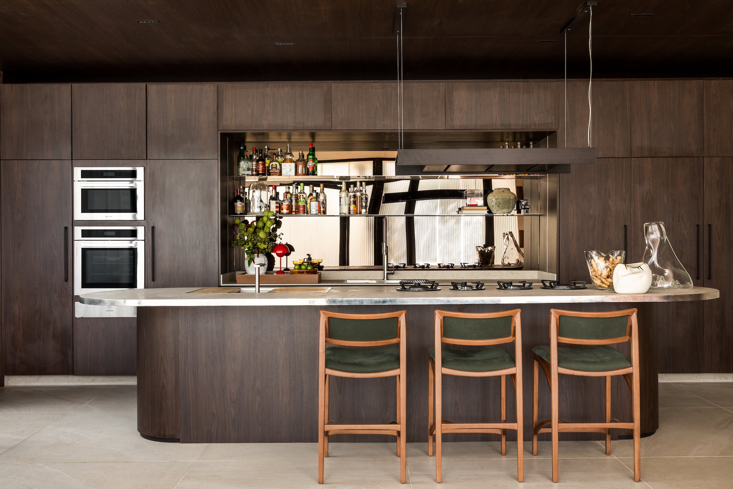 Na Sala Entre Casulos, o balcão foi desenhado pela arquiteta e executado em granito Café Imperial escovado em Pietra Fina – uma técnica de corte de rochas naturais que permite obter peças finas e elegantes, com peso reduzido e maior resistência. O desenho autoral somado ao revestimento em pedra natural tem ganhado cada vez mais espaço no décor!