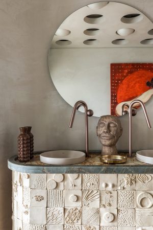 As formas suntuosas são destaque nesta edição da mostra. Da escada do Hall da casa à bancada do Banheiro Intimidade na Forma, os desenhos autorais e seus acabamentos primorosos se impõem como protagonistas dos ambientes.