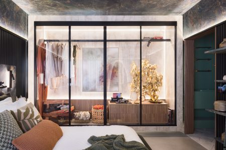 Além do uso do porcelanato como matéria-prima estrutural para mobiliário autoral e superfícies protagonistas do Quarto Tekoá, o projeto investe na arquitetura emocional. No closet, a estrutura flutuante combina fechamento em vidro e iluminação automatizada para destacar itens pessoais e obras de arte, propondo uma decoração intencional e afetiva.