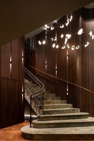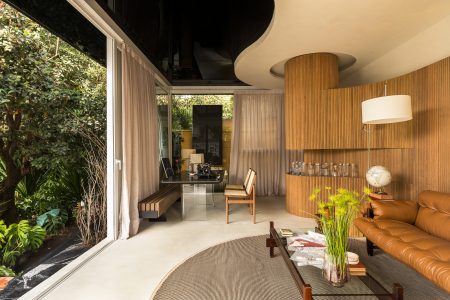 A Casa Prates reconhece o valor da arquitetura, arte e design brasileiros em um projeto que prioriza as formas suntuosas, os materiais naturais e os elementos afetivos. Um destaque exclusivo é o forro preto em lona tensionada curva, solução que cobre todo o plano horizontal superior do ambiente e confere o efeito de espelho d’água invertido.