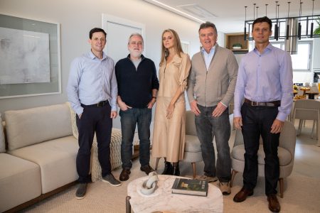 Os apresentadores do Grupo RIC Reinaldo Bessa e Carlos Eduardo Canto, com os diretores da Swell Construções, Leonardo, Vanessa e Thiago Pissetti (foto: Cassiano Rosário)