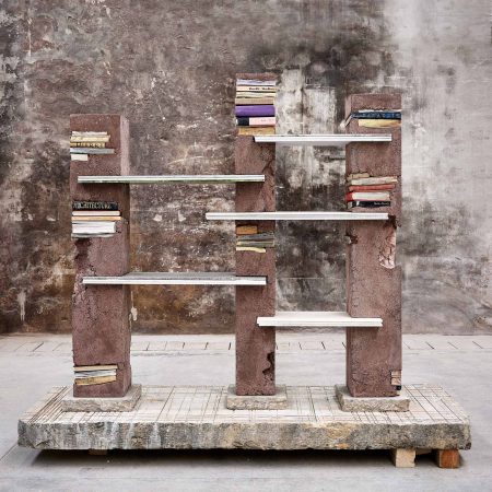 Além de instalações, peças de design também incorporam literatura e cultura como inspiração, a exemplo da coleção “Bibliothèque” de Aline Asmar d’Amman, exibida na galeria Rossana Orlandi. Essa linha de esculturas funcionais, feita de pedra, concreto e livros selados, cria um material poético. Livros selecionados são empilhados como tijolos e envolvidos por concreto com marcas, resultando em objetos evocativos.