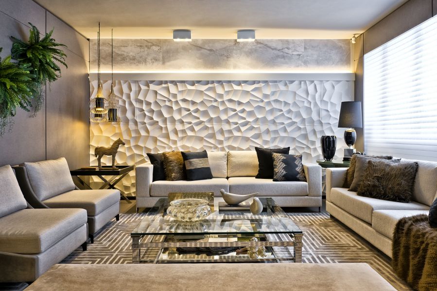 O destaque é o conjunto criado pela mistura de texturas dos materiais utilizados: as paredes menores são revestidas por mármore branco Paraná e placas 3D em gesso; e as maiores receberam painéis em marcenaria que remetem ao linho cinza. O mobiliário com traços retos é quebrado pela mesa lateral redonda em laca verde. Além disso, atenção especial para o som que será reproduzido por uma nova tendência instalada pela Livemax e a iluminação descentralizada.