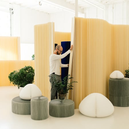 Assim, a visita na feira foi guiada em meio às programações de conteúdos que ajudaram a colocar o tema sustentabilidade em pauta, incluindo artesanato, circularidade, materiais e reutilização, e algumas das mudanças e soluções necessárias para o futuro. Rodolfo Agrella Design Studio (RADS Group) foi o convidado para projetar a experiência física da feira que aconteceu no Centro de Convenções Jacob K. Javits durante o festival de design NYCxDESIGN, explicado no fim deste texto.