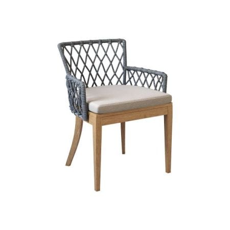 Com base em madeira maciça, é uma cadeira estável e elegante. O espaldar é em alumínio revestido de corda, e seu assento, em espuma especial para área externa e revestimento em tecido garden.