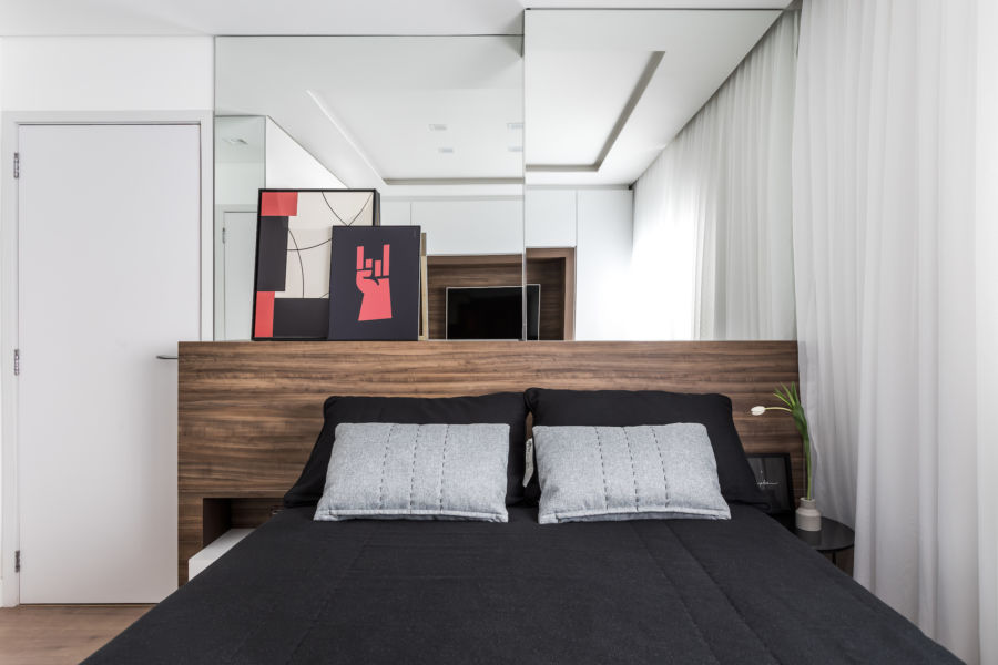 Na suíte, de 10 m², a forma encontrada para aliar o conforto da televisão no quarto com a necessidade de armários foi mesclar as duas demandas em apenas um móvel, que trouxe ainda mais funcionalidade ao ambiente. O uso de painéis de espelho acima da cabeceira proporciona mais amplitude e sensação de bem-estar aos moradores. O recurso também foi utilizado na sala de jantar e no escritório.