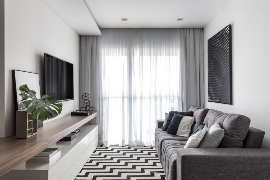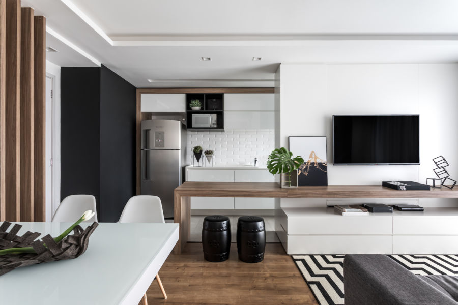 Uma saída para aumentar o espaço de circulação foi derrubar a parede entre a cozinha e a sala de estar, inserindo um armário funcional para ambos os ambientes: de um lado, um local para armazenar utensílios altos, como vassouras e tábua de passar; de outro, um painel para a televisão da sala.