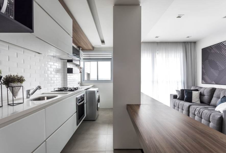 Ainda pensando em formas de otimizar a área do apartamento, as arquitetas integraram a cozinha à lavanderia, unificando o espaço ao utilizar um tampo único de Silestone branco. No ambiente, o porcelanato cinza foi o revestimento escolhido para, juntamente com o de tijolinho branco na área molhada, remeter a um estilo mais industrial. O toque final fica por conta da parede de lousa preta, que auxilia na praticidade do dia-a-dia e traz um charme ao apartamento!