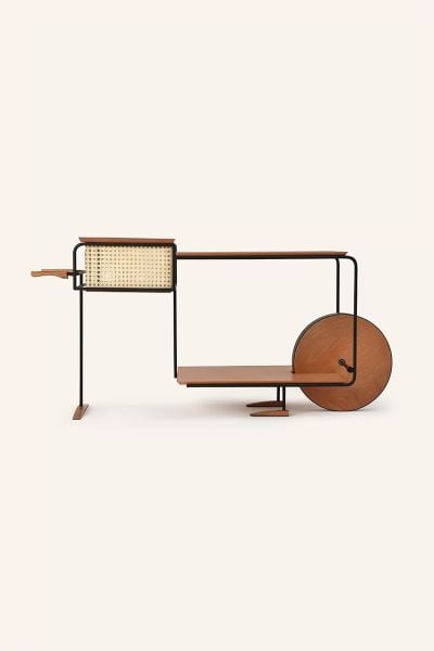 Feito com madeira jequitibá, o Bar Carriola da Misci possui detalhes em palha natural. O móvel excêntrico conta com duas prateleiras, uma cesta removível e uma roda, todas com acabamento chanfrado. Onde encontrar? No site