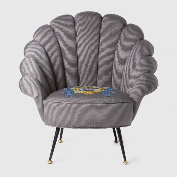 Com o design de uma concha, a poltrona em tecido moiré da Gucci possui uma aparência texturizada que lembra ondas. A almofada principal possui um brasão bordado à mão, um processo que leva, aproximadamente, cinco horas para ser concluído. Onde encontrar? Na Av. do Batel, 1.868 – Batel. Preço: US$ 7.200,00 (aproximadamente R$ 38.160,00).