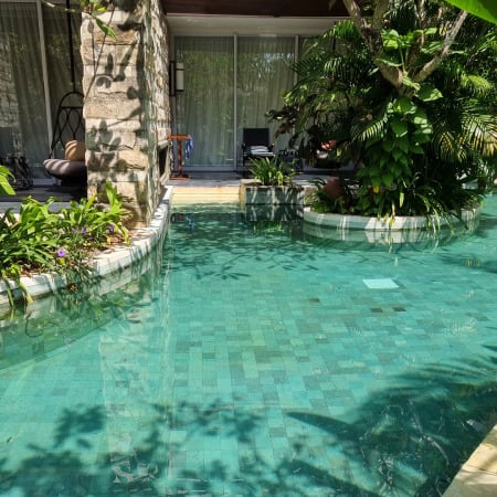 Para escolher o revestimento, o especialista explica: “O primeiro passo para escolher a pedra Hijau para sua piscina é avaliar os cortes da pedra e as melhores possuem cortes precisos em suas laterais. Além disso, a cor da Hijau deve ser avaliada, uma vez que ela precisa ter tonalidades vivas que se misturam entre os tons de verde com excelentes acabamentos”, afirma Fernando Martins.