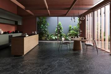 Já o porcelanato Black Misty, da Coleção Marmo, faz um convite inusitado para ingressar na magia da meia-noite. Cada peça evoca uma atmosfera misteriosa e encantadora, como se as estrelas estivessem refletidas no chão de cada projeto. A sutileza da magia detalha o brilho presente entre os veios e os tons mais escuros do material e ao mesmo tempo proporciona um efeito sutil de movimento e profundidade, graças a um acabamento escovado e à aplicação de finas granilhas. Disponível no formato 123 x 123 cm, indicado para ambientes de alto tráfego, seja residencial ou comercial.