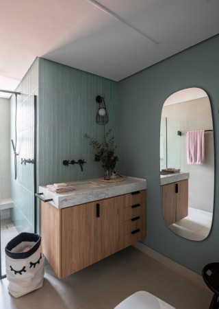 Na bancada, o misturador de parede Duna Clássica Deca em black matte faz composição com detalhes presentes no mobiliário e no décor do espaço. A área de banho reúne o chuveiro de parede Acqua Plus com desviador e acabamento de registo Duna Clássica no mesmo tom de acabamento.