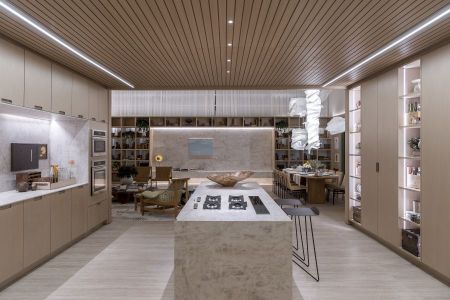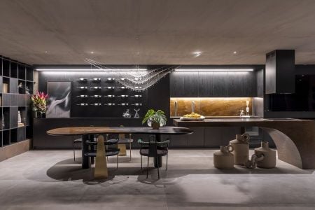 Outra cozinha que marca a edição da CASACOR São Paulo é a assinada pela arquiteta Paola Ribeiro. Com 270m², o espaço é composto por living, cozinha, adega, quarto com banheiro e closet, home office, sala de jantar e varanda. Para a cozinha, Paola especificou a coleção Maracangalha para compor a bancada, trazendo a versatilidade da peça que possibilita uma aplicação curva e a peça Recital WH, trazendo uma bancada gourmet única.